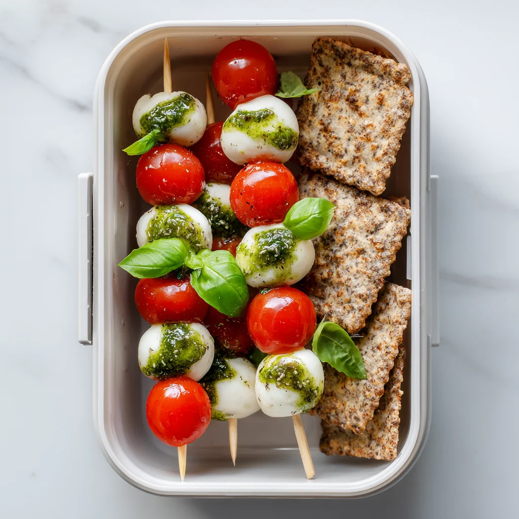 Caprese skewers pack easily and stay fresh when kept chilled. They’re a great choice for kids who prefer bite-sized, snack-style meals and for adults who want a lighter lunch that still feels satisfying. To round out the box, pair them with fruit or a small serving of whole-grain crackers.