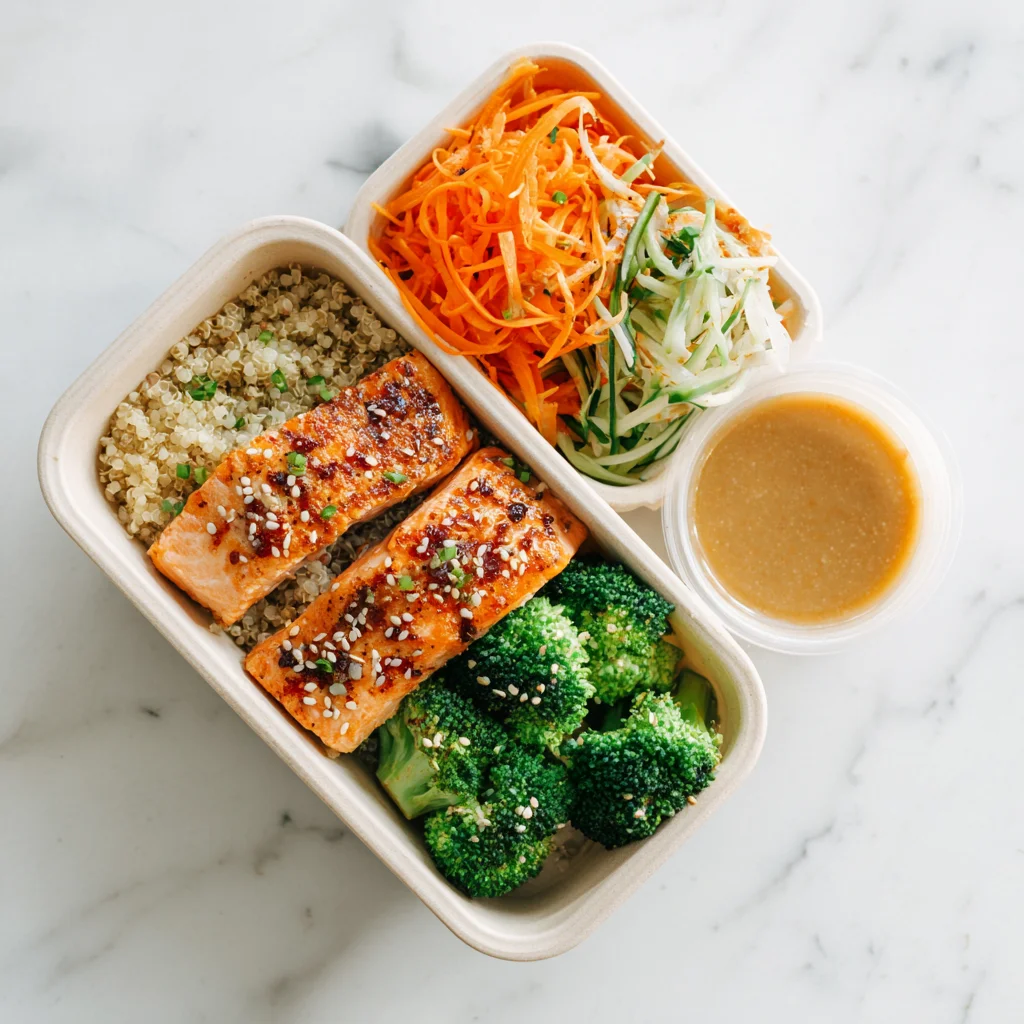 Grain bowl with salmon, broccoli, and carrots in a lunchbox.